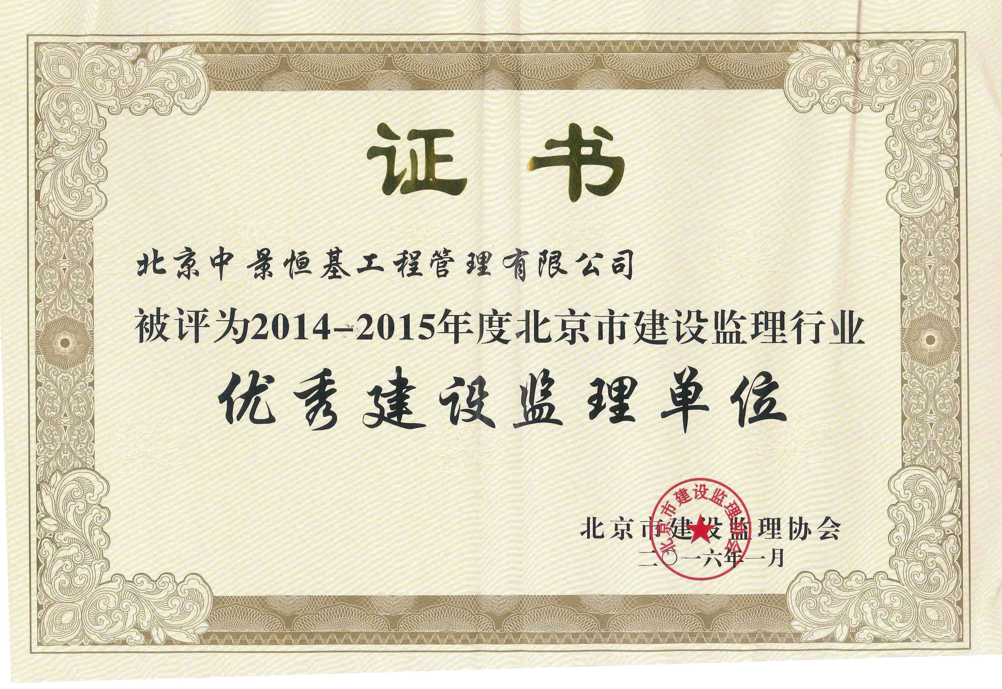 “优秀建设监理单位”荣誉证书