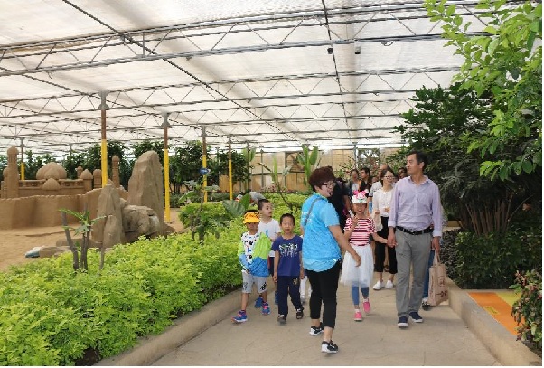 花果山,水帘洞,沙漠探险等景点,园艺结合着游乐设施寓景于乐,很快就将小朋友们活动伊始的拘束感和隔阂感一扫而空。对一切熟悉起来的孩子们开始在园中嬉戏,也为植物园带来了别样的节日氛围。而这种氛围显然也影响了家长们。在工作中严肃认真的面容逐渐消失了,取而代之的是一张张富有少年感的面庞。工作与生活中的紧张感暂时被放下,亲子同游独有的喜悦感慢慢地被展现了出来。