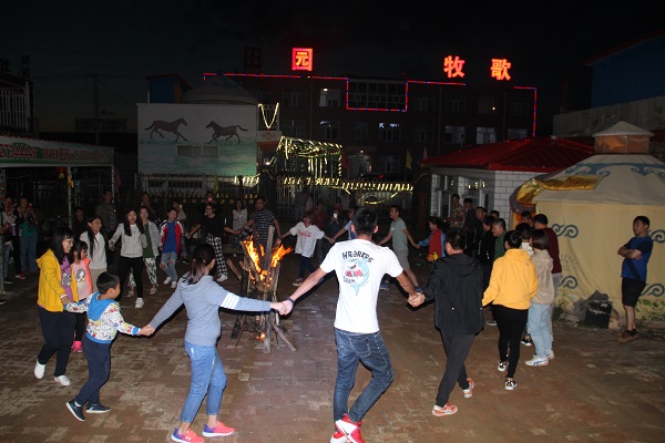 傍晚时分,品尝完农庄美味的佳肴,大家一起手拉手围绕着冉冉篝火,唱起让人心醉的蒙古歌,跳起优美的安代舞,欣赏着火星四溅的打铁花,载歌载舞,放飞心情。